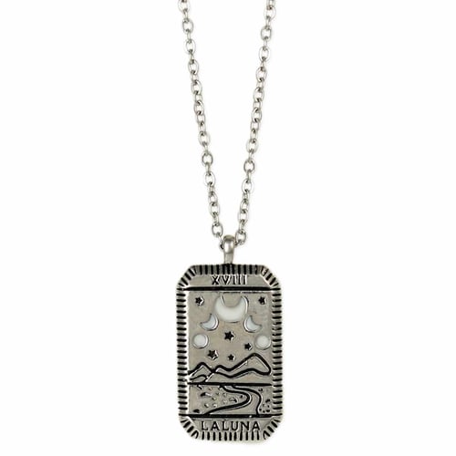 Your fashion fortune is written in the cards. Silver moon tarot card features white lunar design. The moon tarot card, titled in Spanish La Luna, is a symbol of growth and change. This necklace is sure to add meaning to your fashion.