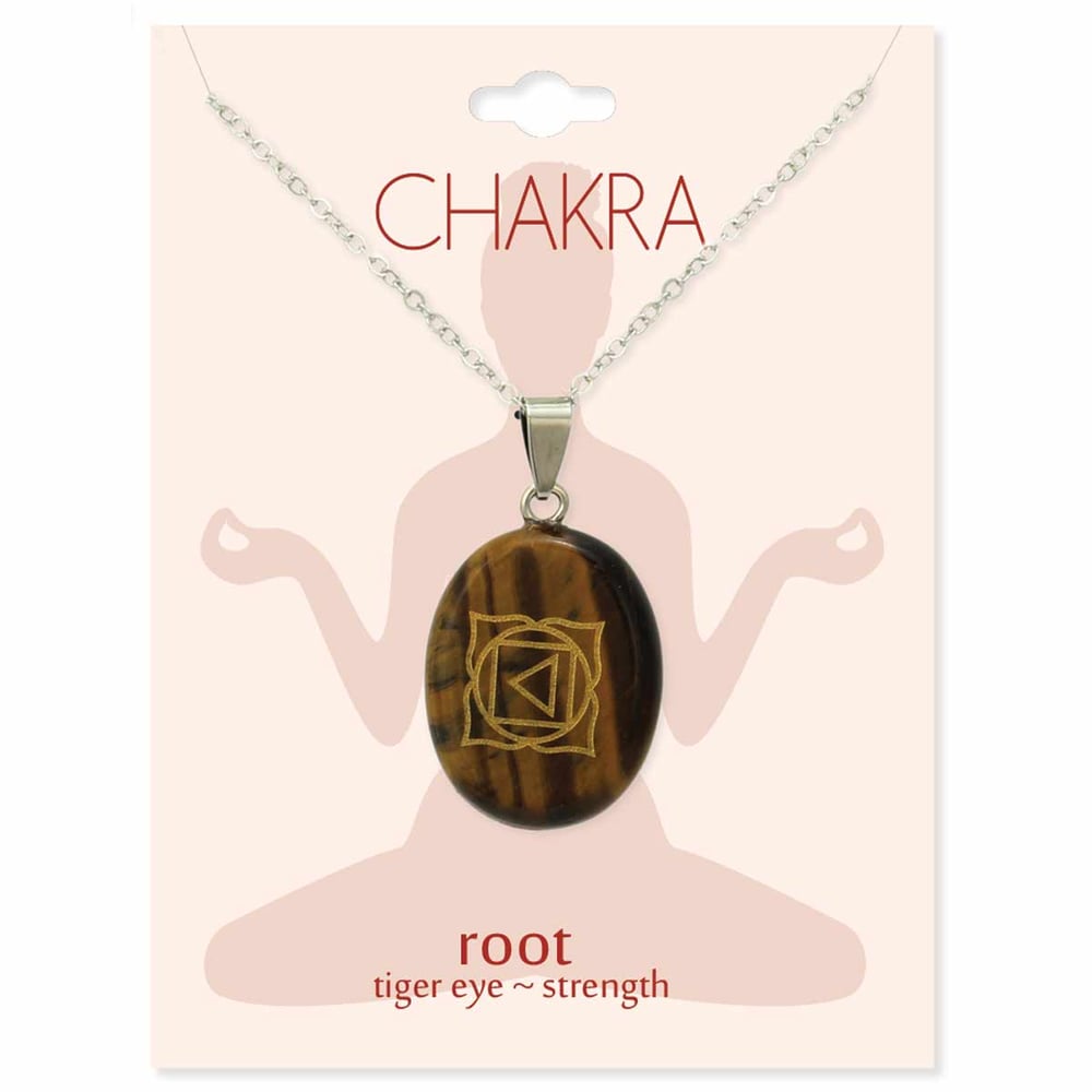 Inspire spiritual strength wearing this striking chakra stone necklace. An oval tiger eye pendant features an engraved gold foil root chakra symbol. Channel courage and grounding with this iridescent tiger eye root chakra necklace.